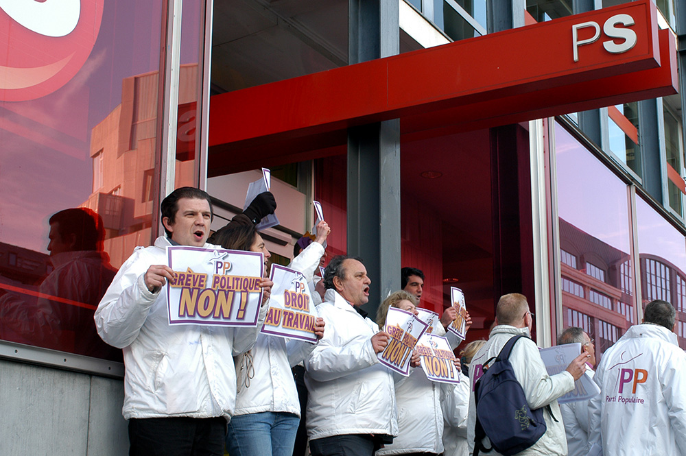 Le Parti Populaire a marqué la désapprobation de la majorité silencieuse de ce pays, en érigeant un piquet de grève devant la FGTB et en bloquant l’entrée ce mardi 16 décembre à 11h30. Un second piquet a été installé à 12h00 devant le siège du PS pour les mêmes motifs. Le Bureau du PS devait s’y tenir à 12.30 h. Les cadres et ministres du Parti Socialiste qui se sont présentés, n’ont pu entrer dans le bâtiment, ni par l’avant ni par le parking arrière, jusqu’à ce que la police de Bruxelles, vienne dégager l’entrée du parking et oblige les militants du PP à se retirer.