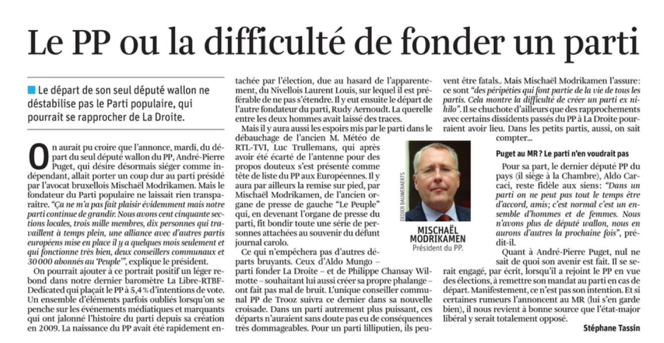 Le départ de son seul député wallon ne déstabilise pas le Parti Populaire, qui pourrait se rapprocher de la Droite.